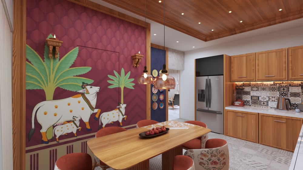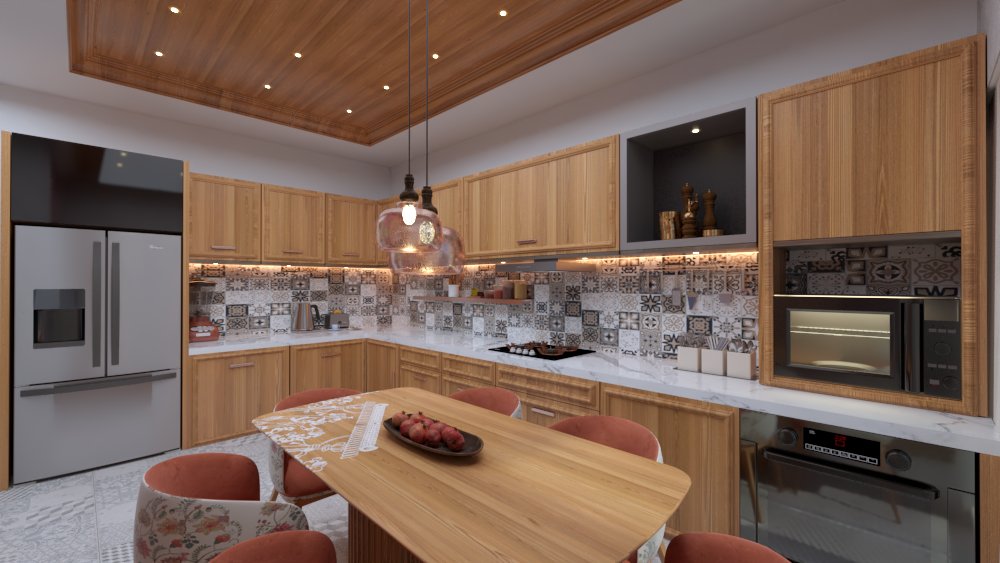 This luxurious residence draws inspiration from traditional South Indian homes, blending heritage with modern sophistication. Rich teak wood features prominently—seen in cabinetry, carved wardrobes, and ceiling details—creating a warm, tactile palette. Handcrafted motifs and curated art reflect cultural depth, while patterned tiles and soft lighting add character. Elegant white marble flooring weaves through the space, offering contrast and refinement. Together, these materials craft a home that feels rooted in tradition yet refined for contemporary living.